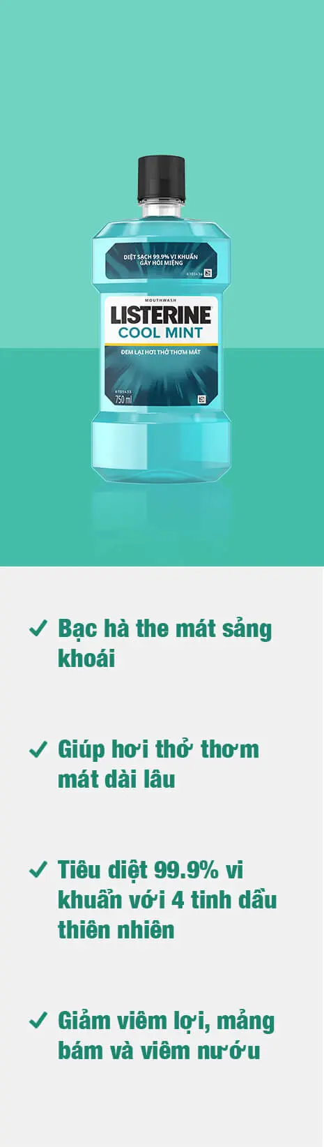 Chúng tôi cũng có dòng sản phẩm đáp ứng những nhu cầu chăm sóc răng miệng khác nhau, từ vệ sinh nướu đến bảo vệ men răng. Bên cạnh chải răng, dùng chỉ nha khoa và đi khám nha sĩ, hãy sử dụng thêm nước súc miệng với hiệu quả được công nhận trong việc loại bỏ mảng bám và chống viêm nướu. Một chế độ chăm sóc hàng ngày không tốn bao nhiêu thời gian mà lại đảm bảo sức khỏe răng miệng về lâu dài, với kết quả thật đáng tự hào. Hãy tìm sản phẩm phù hợp và sử dụng đều đặn như chỉ dẫn, bạn sẽ cảm nhận sự khác biệt chỉ trong vòng 21 ngày. Hạn chế sâu răng, loại trừ mảng bám, ngừa vôi răng, diệt khuẩn, củng cố men răng - bất kể mục tiêu nào bạn muốn, nước súc miệng LISTERINE® đều có thể mang đến kết quả đột phá.
